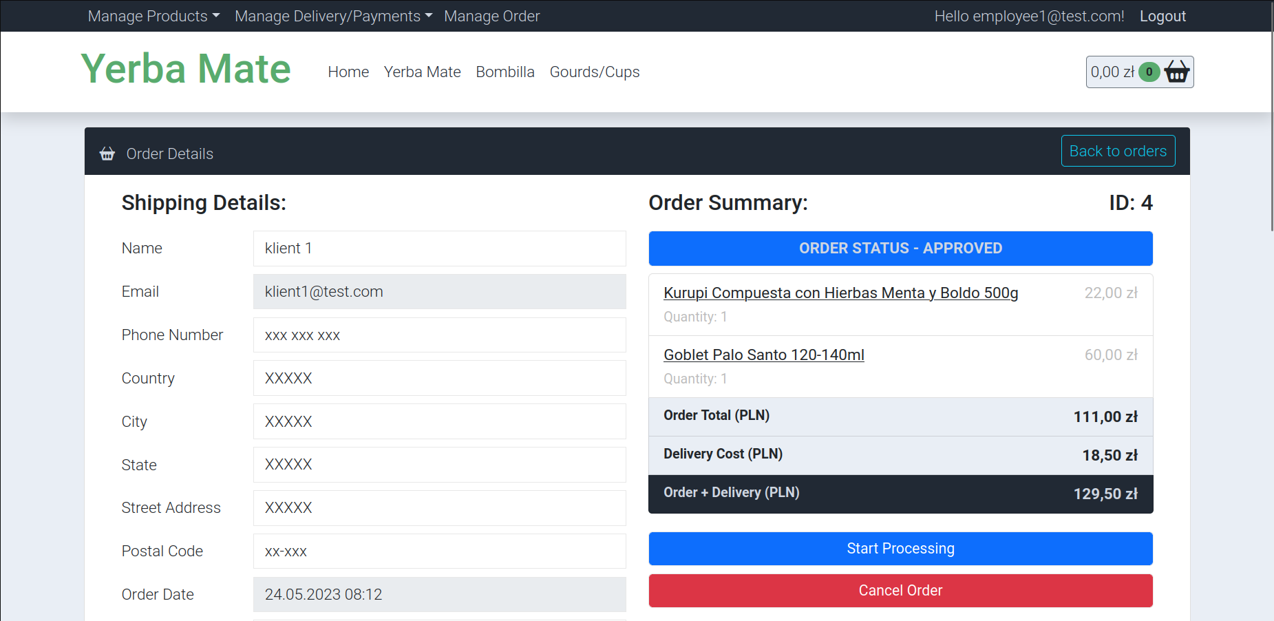 Administrator lub Pracownik może również tworzyć nowe, edytować lub usuwać istniejące produkty, metody płatności i dostawy.